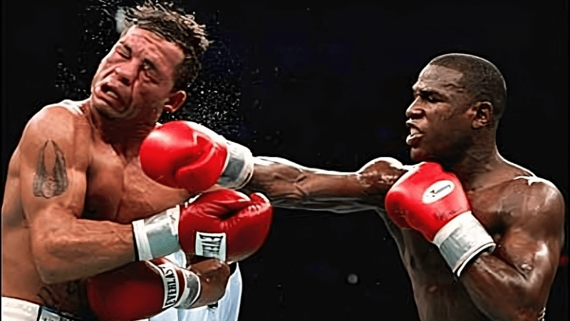 Late in the first round, as Gatti bent forward, Mayweather leaned on him and continued to punch despite the referee's instruction to stop. Gatti looked to the referee to complain, but the punches continued.